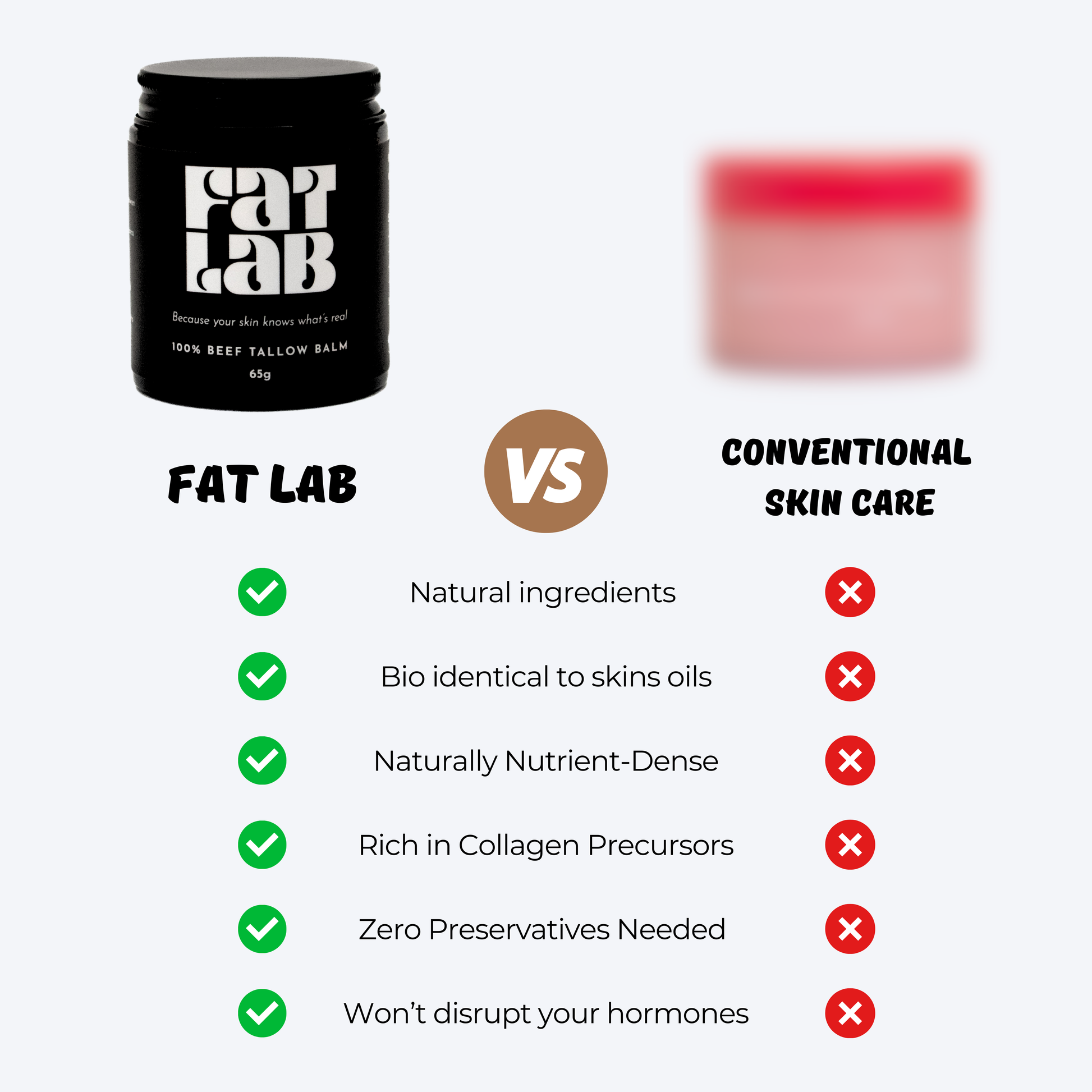 Yes, we use 100% grass-fed beef suet fat as the base of our skincare. Suet is the clean, hard fat found around the kidneys and loins of healthy, grass-fed cattle, known for being nutrient-dense and exceptionally pure. When it’s slowly rendered, it turns into tallow, a rich stable fat naturally packed with vitamins A, D, E and K, as well as conjugated linoleic acid (CLA) and essential fatty acids that closely mirror the oils our skin produces on its own.